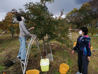 血液の病気で3年間闘病生活を送った孫も、今では寛解。孫もおだてりゃ脚立に登る。大喜びで上の方のリンゴを取っていました。